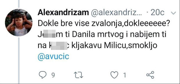 Da podsetimo, ona se sumnjiči da je koristeći nalog "Alexandrizam" vređala predsednika, a psovke su upućene i njegovom sinu, koji je nazvan i "mrtvim"?! Zatim se i kćerka Milica našla na udaru.