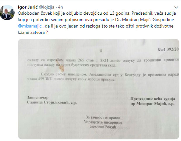 "Sud oslobodi čoveka koji je obljubio devojčicu od 13 godina koja je, pritom, ostala trudna, uz obrazloženje optuženog da 'nije znao da je to zabranjeno'. Da li pripadnost jednoj nacionalnoj manjini abolira zločin? Da li je normalno da u 21. veku opravdavamo prinudne brakove i kako se oseća devojčica od 13 godina koja je zatrudnela jer "tradicija" tako nalaže", objavio je Jurić na Tviteru.