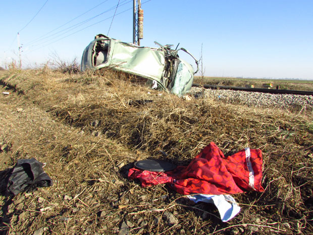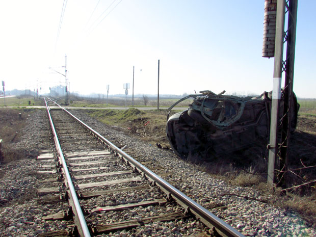 Smrskano vozilo na pružnom prelazu kod Zmajeva Foto L. Kiš