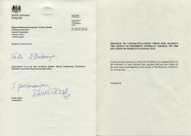 Predsednik Srbije Tomislav Nikolić povodom obeležavanja Dana državnosti Republike Srbije, primio je čestitku Njenog Kraljevskog Visočanstva Elizabete II