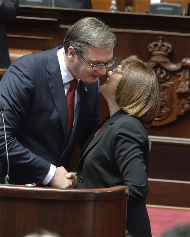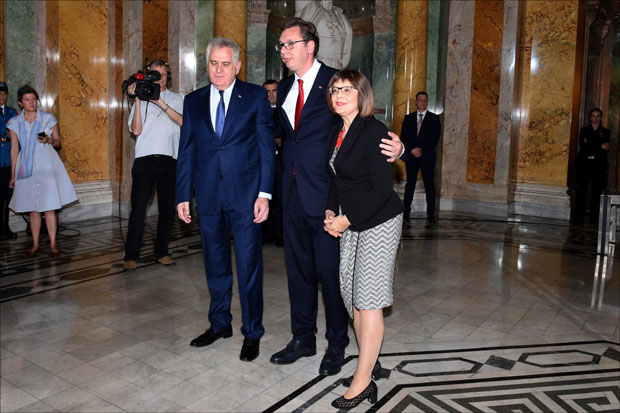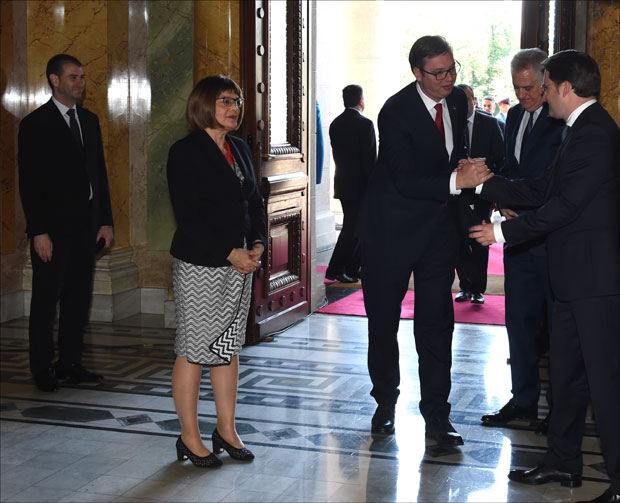 Vučića i sada već bivšeg predsednika Srbije Tomislava Nikolića dočekala je predsednica parlamenta Maja Gojković.
