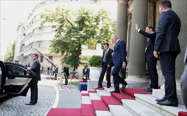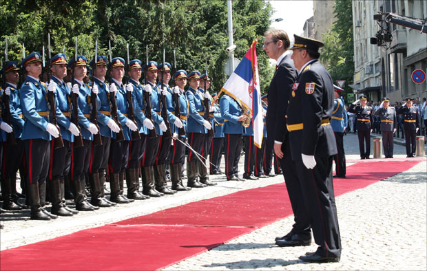 Ispred zdanja na Andrićevom vencu intonirana je himna Srbije, načelnik generalštaba VS general Ljiubiša Diković predao mu je raport, i izvršio je smotru, a zatim ga je dočekao Tomislav Nikolić koji će mu predati dužnost šefa države.