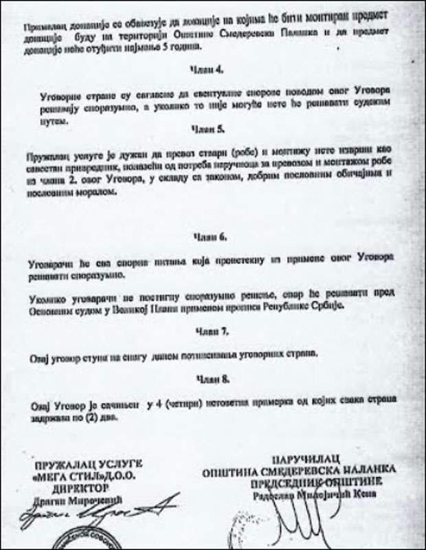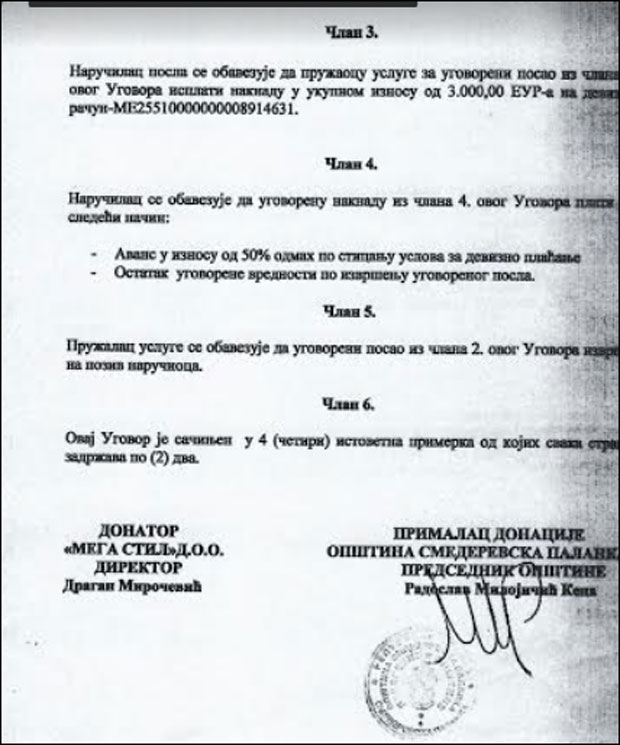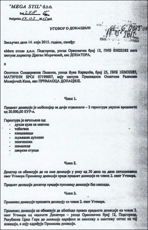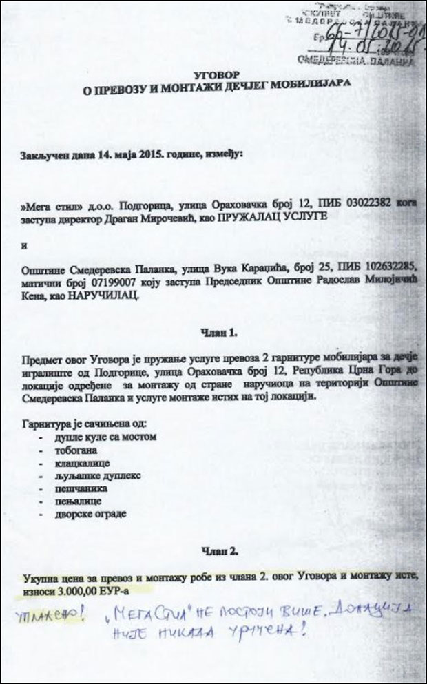 -Naš čuveni Kena, tako se čovek i na ugovorima potpisivao uz ime i prezime, volšebno je nalazio neke „divljake“, sa kojima je sklapao „lažne poslove“ koji su opštinu debelo koštali – priča za portal Embargo čovek iz bivše opštinske strukture. – Evo primera, kako je Kena poslovao: sklopio je 2015. ugovor o Donaciji sa nekom firmom iz Podgorice, „Mega stil“ d.o.o. u vlasništvu izvesnog Dragana Miročevića! Predmet donacije i ovog ugovora bio je dečiji mobilijar, dve garniture za dečije igralište u vrednosti 20.000 eura! Svako bi rekao super! Svaka čast. Nevolja je u tome što taj dečiji mobilijar nikada nije stigao u Smederevsku Palanku.