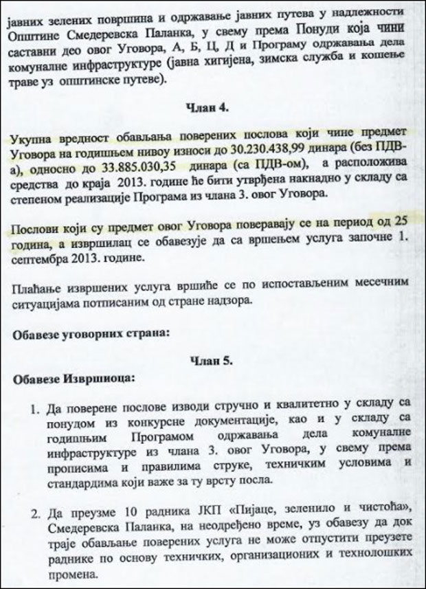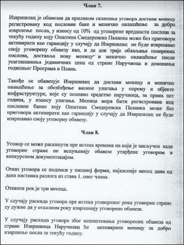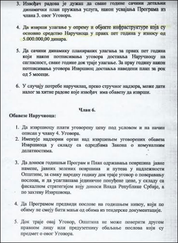 Ovaj ugovor je sam po sebi primer šta ne treba raditi i šta ne sme da radi čelnik lokalne samouprave. Ali, vrhunac licemerja je zapisan u članu 5. Ovog ugovora u kome se kaže, da je izvršilac dužan da u prvih pet godina rada uloži u svoju opremu kao osnovno sredstvo rada čak 5.000.000 dinara!? Šta to znači? Godišnje im se bez PDV-a uplaćuje više od 30 miliona dinara, a oni da u svoju opremu ulože ogromnih milion dinara… Pa to je smešno!