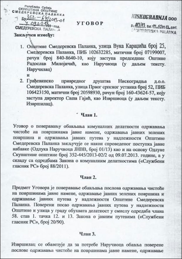 -Tako je naš bivši predsednik opštine sklopio ugovor 2013. sa privatnom firmom Niskogradnja o obavljanju komunalnih poslova, održavanja zelenih površina i javnih puteva na teritoriji opštine Smederevska Palanka – nastavlja priču za Embargo naš sagovornik.