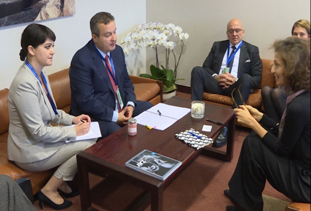 NA marginama Generalne konferencije Uneska, Dačić se sreo i sa generalnim direktorom Uneska Irinom Bokovom. On se Bokovoj zahvalio na principijelnom poštovanju Rezolucije 1244 u pitanjima od interesa za našu stranu i na naporima koje je uložila na planu zaštite kulturne baštine u zonama oružanih sukoba.