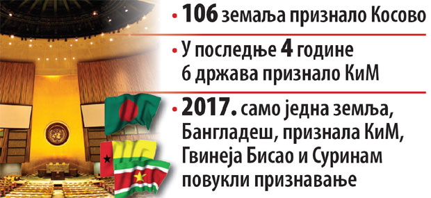 Inače, prema evidenciji Prištine, broj zemalja koje su priznale Kosovo za desetak je veći od brojke od 106, kojom "barata" Beograd. Iz našeg MSP poručuju da su zvaničnici Omana, Centralnoafričke Republike, Nigerije, Ugande, Sao Toma i Principe u više navrata demantovali Prištinu, koja tvrdi da su ove zemlje priznale Kosovo.