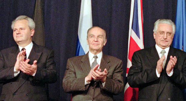 Milošević, Izetbegović i Tuđman posle postizanja dogovora u Dejtonu 1995.