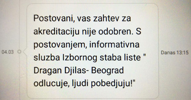 - Poštovani, vaš zahtev za akreditaciju nije odobren. S poštovanjem, informativna služba Izbornog štaba liste "Dragan Đilas - Beograd odlučuje, ljudi pobeđuju".