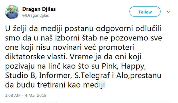 "Novosti" nisu bile jedine koje su stavljene na crnu listu ove grupe građana. Naime, prethodno, juče u 10 časova pre podne Dragan Đilas je na svom tviter-nalogu napisao: