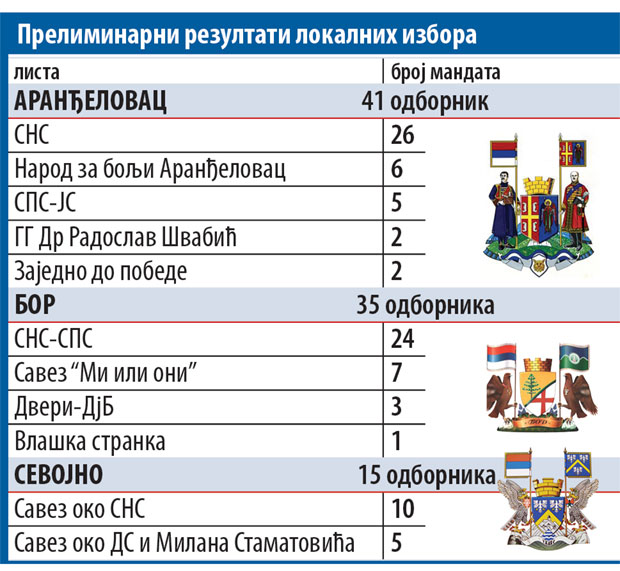 Naprednjaci će, zajedno sa socijalistima, imati komotnu većinu i u Boru i Aranđelovcu. U Aranđelovcu upisano 37.711 birača, a "zaokruživalo" njih 55,08 odsto