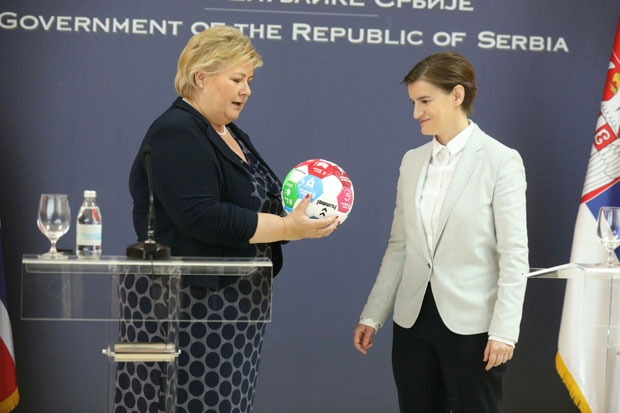 Premijerka Norveške Erna Solberg poklonila je, na zajedničkoj pres konferenciji, predsednici Vlade Srbije fudbalsku loptu na kojoj su ispisani ciljevi održivog razvoja.