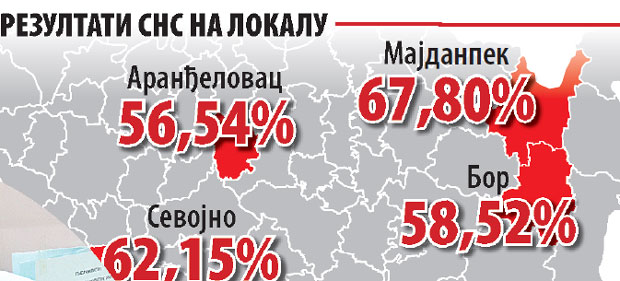 Pobedom u Majdanpeku, naprednjaci su nastavili izborni cunami "na lokalu", koji im je u većini opština i gradova, gde se glasalo ove godine, doneo natpolovičnu većinu. U Sevojnu su osvojili 62,15 odsto, u Aranđelovcu 56,54, a u Boru 58,52 procenta glasova. U Beogradu je za SNS glasalo 44,99 odsto birača, ali su, zbog raspodele glasova, dobili natoplovičnu većinu mandata u gradskoj skupštini.