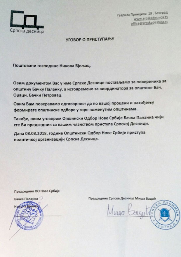 Bjeljac je poneo veliki broj pristupnica u Bačku Palanku da učlani sve ljude iz odbora Nove Srbije, jer kako je istakao u Srpskoj desnici je prepoznao inicijativu iskrenog zalaganja za Srbiju i njen narod.