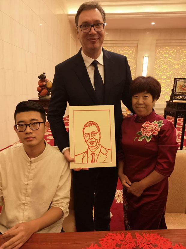 KINESKI premijer Li Kećijang priredio je sinoć večeru za učesnike Svetskog ekonomskog foruma, na kojoj je predsedniku Vučiću učinjena posebna čast. Naime, muzičari su u jednom trenutku zasvirali poznate pesme "Pukni zoro" i "Ovo je Srbija". Tu je dobio i neobični poklon - njegov portret napravljen kao kolaž od iseckanih salveta.