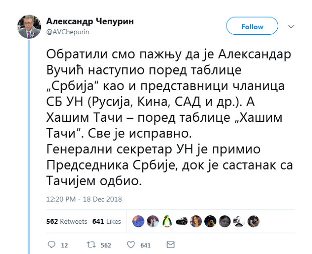 On je takođe naveo da je "generalni sekretar UN primio predsednika Srbije, dok je sastanak sa Tačijem odbio".