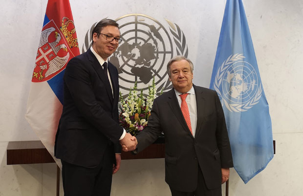 | SASTANAK SA GUTERESOM ![]() VEĆE učešće UN u rešavanju kosovskog pitanja, predsednik Aleksandar Vučić zatražio je i tokom razgovora sa generalnim sekretarom UN Antoniom Guteresom. On je sa prvim čovekom svetske organizacije razgovarao o jednostranim potezima Prištine i situaciji u regionu i zahvalio mu se što je svojim saopštenjem izrazio zabrinutost zbog odluke Prištine da formira oružane snage. Naglasio je da je Priština svojim potezima ugrozila regionalnu stabilnost, kao i da se Srbija i dalje zalaže za nastavak dijaloga, pošto Priština povuče iracionalne odluke. |