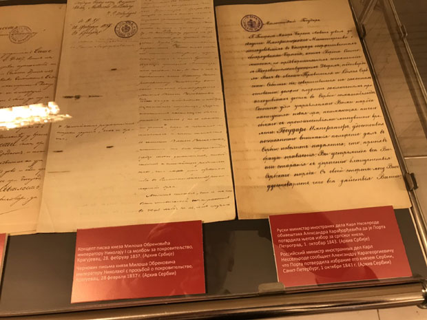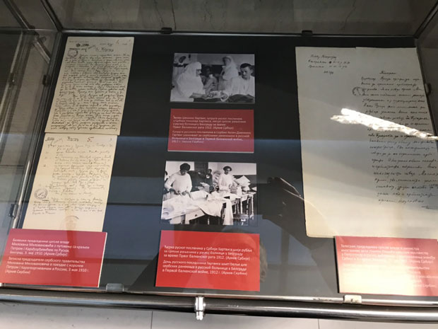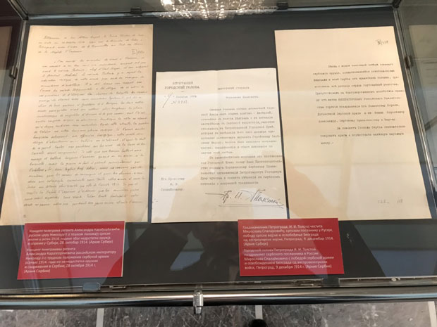 Izložena su dokumenta iz diplomatske, kulturne, ekonomske i crkvene istorije o pomoći Rusije Srbiji u toku Prvog srpskog ustanka i Velikog rata