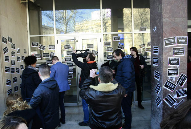 PREDSTAVNICI SzS oblepili su u ponedeljak zgradu beogradske skupštine nalepnicama sa "lažima Aleksandra Vučića" i razvukli transparent "Jedan od pet miliona". Zamenik gradonačelnika Goran Vesić rekao je da je uprava u obavezi da čuva grad, ne želeći da otkrije čime je premazan Terazijski tunel, pa učesnici protesta tokom vikenda nisu mogli da lepe nalepnice u njemu: