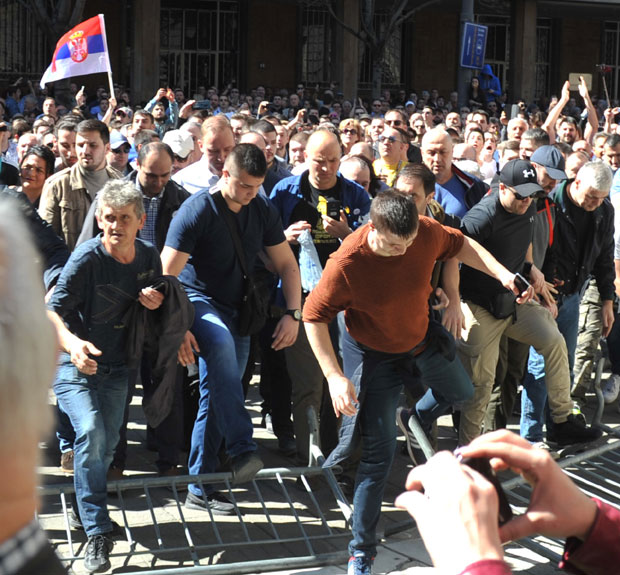 A onda je pred sedištem beogradske policije došlo do novog meteža. Razulareni demonstranti su u jednom trenutku jurnuli na policajce. Gađali su ih najpre kamenicama, pokušavajući da probiju kordon. A onda su ih zasuli flašama. Srećom, policija nije uzvratila, pa nije bilo težih posledica.