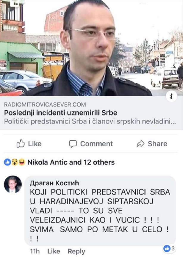 -Koji predstavnici Srba u Haradinajevoj šiptarskoj vladi... To su sve veleizdajnici kao i Vučić! Svima samo po metak u čelo- napisao je Kostić preteći ispod teksta u kojem je potpredsednik Srpske liste rekao da su poslednji incidenti uznemirili Srbe na KiM.