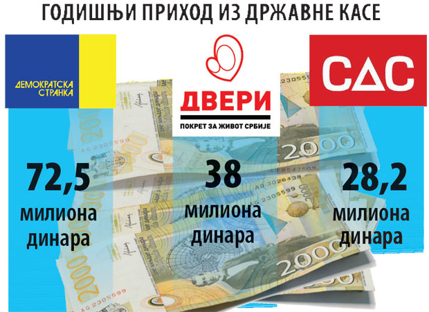Samo na osnovu mesta u republičkom parlamentu, partije svakog meseca dobijaju između 155.000 dinara, koliko, prema podacima Ministarstva finansija, sleduje Zelenoj stranci Srbije, i 33 miliona, koliko pripada naprednjacima kao najjačoj političkoj opciji u državi. Demokratama, koje su nedavno donele odluku o bojkotu, svakog meseca na račun legne pet miliona dinara. Dveri dobijaju oko 3,3 miliona dinara, a SDS Borisa Tadića oko 2,3 miliona dinara.