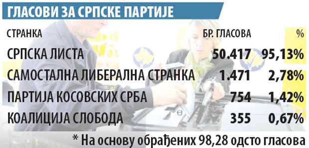 Naime, Srska lista je u 22 opštine, u kojima živi naš narod na KiM, ostvarila ubedljivu pobedu i, prema 98,28 odsto obrađenog materijala, osvojila 50.417 glasova, odnosno 95,13 odsto. Sve ostale srpske liste zajedno su osvojile 2.580 glasova: Samostalna liberalna stranka Slobodana Petrovića 1.471 (2,78 odsto), Koalicija "Sloboda", u kojoj su Nenad Rašić i Rada Trajković 355 (0,67 odsto) i Partija kosovskih Srba Aleksandra Jablanovića 754 (1,42 odsto).