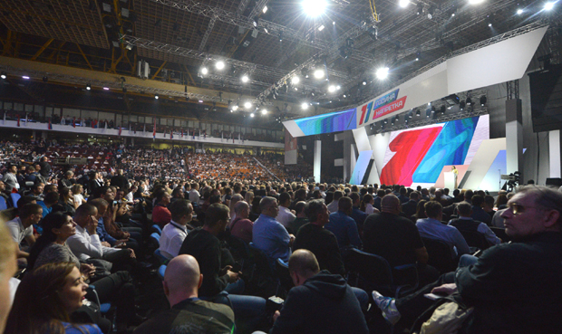 U slavljeničkoj atmosferi, uz zastave Srbije i SNS, u novosadskom Spensu se, prema procenama, okupilo više od 10.000 ljudi, a nekoliko hiljada ostalo je ispred hale, koji će pratiti svečanost preko video-bima.