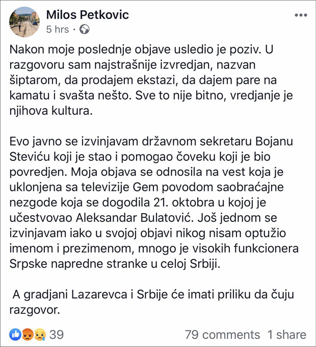 Skandalozna Petkovićeva objava na društvenim mrežama odnosila se na nemilu scenu u Stepojevcu