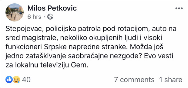 On je napisao:Stepojevac, policijska patrola pod rotacijom, auto nasred magistrale, nekoliko okupljenih ljudi i visoki funkcioneri Srpske napredne stranke. Možda još jedno zataškavanje saobraćajne nezgode? Evo vesti za lokalnu televiziju Gem.