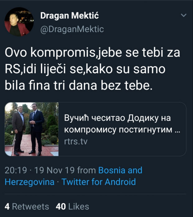 "Ovo kompromis, j... se tebi za RS, idi leči se, kako su samo bila fina tri dana bez tebe", objavio je Mektić psinoć na svom tviter-nalogu, a nakon što je Vučić čestitao srpskom članu Predsedništva BiH Miloradu Dodiku na postignutom dogovoru u vezi sa imenovanjem predsedavajućeg Saveta ministara BiH.