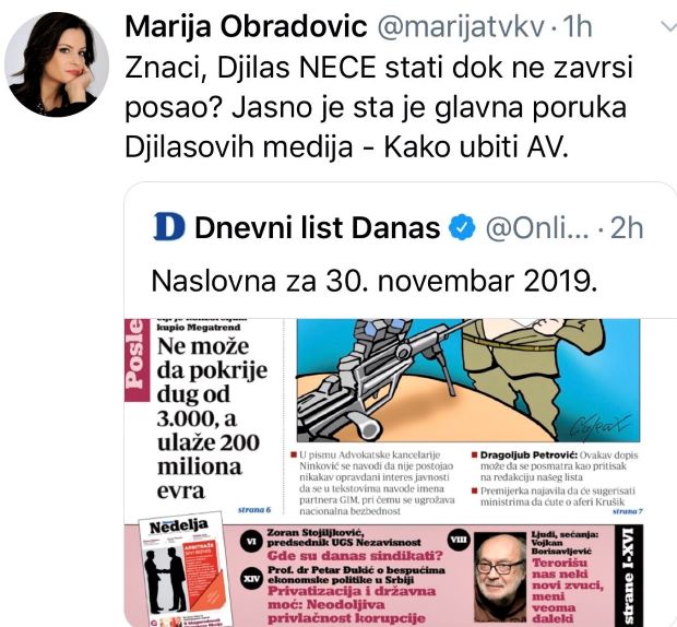 "Naslovna strana Danas-a, na kojoj opet ubijaju Vučića, nije za osudu ona je za lečenje. Posle NIN-a Danas je ponovio - ubiti Vučića je jedina politika koju SZS nudi, san koji sanjaju. Njihov san o ubijanju Vučića je noćna mora svakog normalnog čoveka", izjavio je ministar odbrane Aleksandar Vulin komentarišući naslovnu stranu dnevnog lista Danas.