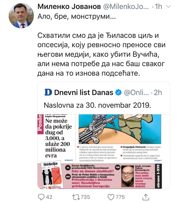 Na naslovnu stranu lista "Danas" reagovao je i predsednik Glavnog odbora SNS Milenko Jovanov.