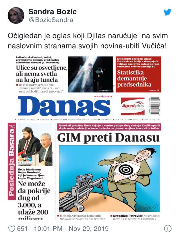 Ovaj potez uredništva lista "Danas" usledio je svega dva dana posle bure koju je izazvala fotografija na naslovnici nedeljnika "Nin", na kojoj je snajper koji cilja prvog čoveka Srbije. Zato su u taboru vladajuće koalicije ocenili da to nije slučajno i da se otvoreno poziva na ubistvo šefa države.