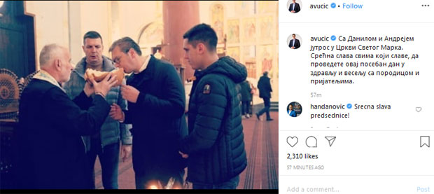 Predsednik je na Instagramu objavio fotografiju iz crkve, uz poruku građanima Srbije: Sa Danilom i Andrejem jutros u Crkvi Svetog Marka. Srećna slava svima koji slave, da provedete ovaj poseban dan u zdravlju i veselju sa porodicom i prijateljima.