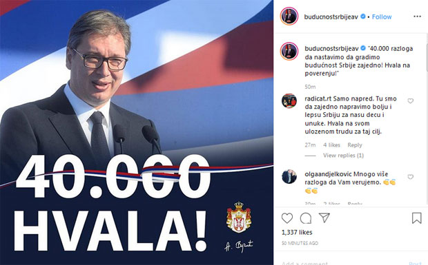 "40.000 razloga da nastavimo da gradimo budućnost Srbije zajedno! Hvala na poverenju!", poručio je Vučić.