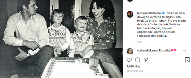 PREDSEDNIK Srbije Aleksandar Vučić na Instagram profilu "buducnostsrbijeav" objavio je fotografiju sa svojim roditeljima Anđelkom i Angelinom i bratom Andrejem i uputio poruku zahvalnosti.