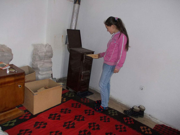 Zatičemo je kod šporeta. Tek je stigla iz škole, a soba hladna. Ručicama, još crvenim od hladnoće, vešto potpaljuje vatru. Malo luča, kaže, lako zapali sitnu smrčevinu, a ona tanje bukove cepanice. Posle, veli, vatru lako održava.