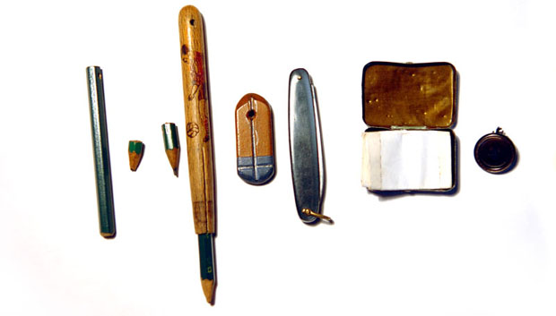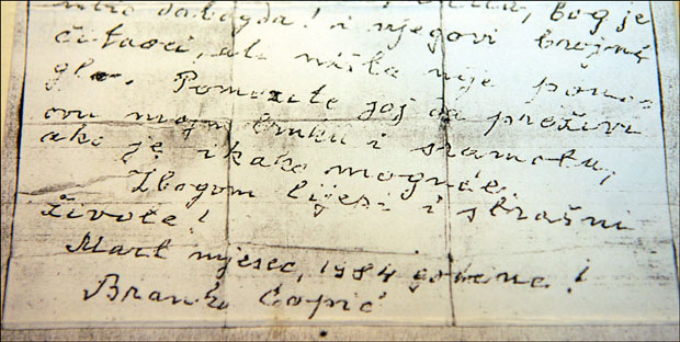Brankov mantil "barberi", kupljen u Parizu, njegove olovke do santimetra istrošene, ispod čijeg su "srca" nastale mnoge priče, gumicu "pelikan", na čijem je naličju pisac urezao krst... Perorez kojim je oštrio olovke, kutijica u kojoj je, ispod Brankovog mosta s koga se iz protesta prema nepravdi strmoglavio, nađeno njegovo oproštajno pismo koje završava rečenicom: "Zbogom lijepi i strašni živote..."