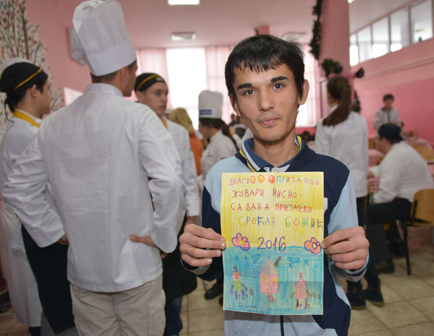- Ovo sam jutros nacrtao za vas - govori Valentino Zenuni (19), dok kuvaru Aleksandru Iliću daje crtež sa porukom: "Dragi prijatelji kuvari, mi smo sa vama prijatelji. Srećan Božić".