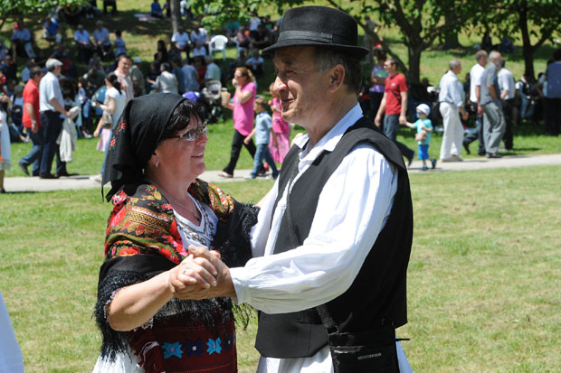Tražeći hladovinu po vrelom danu, smeštaju se pored grupe Slavonaca, koji još jednom uvežbavaju korake “logovca”. U pauzi kažu da su iz Zavičajnog kluba Slavonija iz Beograda, ali, mahom iz Zapadne Slavonije, iz Daruvara, Podravske Slatine, Voćina...