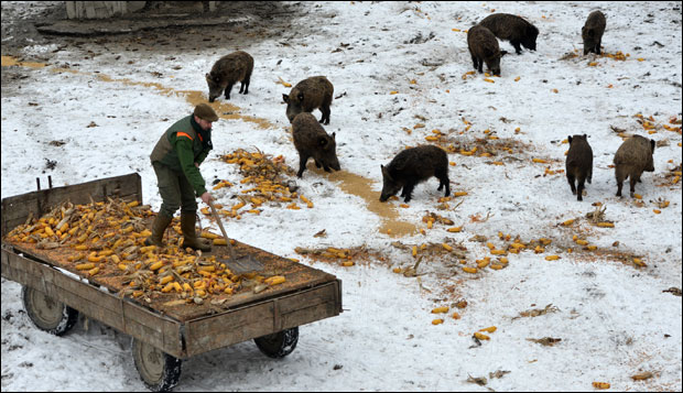 Lovočuvari Miroslav Nedeljković i Duško Medić, kako ekipi "Novosti" smeštenoj na visokoj čeki neposredno uz hranilište objašnjava Vladimir Radić, upravnik "Kamarišta", svakodnevno traktorom dovoze kukuruz u klipu i ječam, kako bi divlje svinje lakše prebrodile zimske mesece sa manjkom hrane. Ubrzo se oko traktora okupilo pedesetak nakostrešenih divljih svinja, sa mladima.