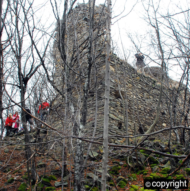 Između drveća se jedva naziru ostaci spiralne staze, zidina i terasa utvrđenja Kulina