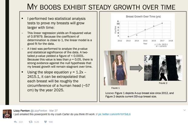 Lizi je svom odabranom poslala email sa naslovom „Zašto bi trebao da se zabavljaš sa mnom“ u kojem je poslala PowerPoint prezentaciju gde je argumentovano opravdala svoje mišljenje.