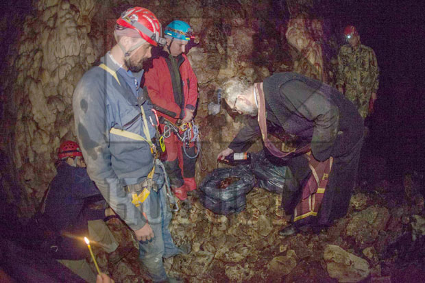Speleolozi i sveštenik kraj pronađenih kostiju