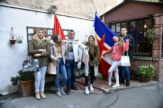 Mladi poziraju uz zastavu sa petokrakom