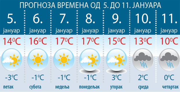 OSIM prolazne oblačnosti, meteorolozi za danas najavljuju toplije i pretežno sunčano vreme. Ujutru će po kotlinama biti magle, a tokom dana u većem delu malo do umereno oblačno. Samo na severu, ujutru ponegde može biti slabe, kratkotrajne kiše. Jutarnje temperature biće od tri stepena ispod nule do sedam celzijusa, a najviša dnevna od devet do 14. Narednih dana, meteorolozi najavljuju porast temperature i izuzetno toplo vreme za ovo doba godine, u pojedinim krajevima i do 17 stepeni! Uz gotovo prolećno vreme proteći će Božić, a snežnog pokrivača neće biti pre sredine januara. Prvog dana vikenda, kako u Republičkom meteorološkom zavodu najavljuju, u većem delu Srbije, pretežno sunčano i natprosečno toplo, a samo u Timočkoj Krajini umereno do pretežno oblačno i malo hladnije. Temperatura će biti od minus jedan do čak 16 stepeni. Slično će biti i u nedelju, sa najvišim dnevnom temperaturama od 12 do 17 stepeni, a u Istočnoj Srbiji - do osam.