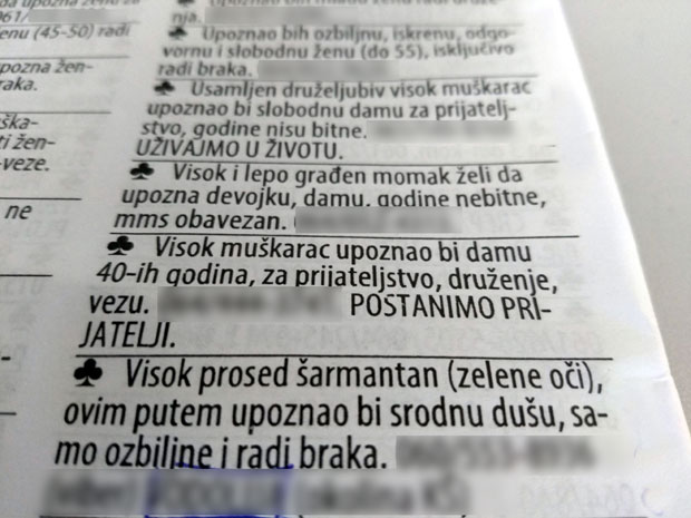 DA BISTE pratili ove ponude, izgleda, potrebno vam je i iskustvo, jer, na više mesta pronašli smo pomalo čudne napomene poput: "proleterke stop!", "dopune ne dolaze u obzir", "rekreativke ne". Kada smo upitali za pojašnjenje, sa druge strane žice odgovoreno nam je da se mnoge udavače javljaju na SMS sa predlogom da im se uplati kredit kako bi potom nazvale.