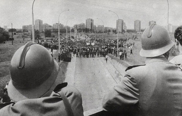 PONIŽENI, pretučeni, uvređeni studenti ponovo pokušavaju da dođu do grada. Ponovo kod podvožnjaka, kordon milicije u obliku ćiriličnog slova P blokirao je prolaz. Šlemovi su se presijavali na suncu. Prugom se kretala kompozicija teretnog voza. Čitav prostor nadletao je helikopter.