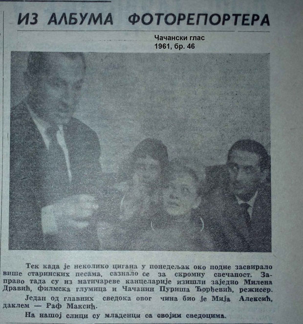 - Bila je udata i za našeg Čačanina Mladomira Purišu Đorđevića. Venčali su se u Čačku 4. decembra 1961. godine. Kum na venčanju bio im je glumac Mija Aleksić.